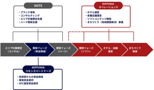 NOTEが主業とするエリア計画策定・物件開発・エリアマネジメント業務に、新たにNOPの宿泊施設・店舗運営、まちづくり推進機能が加わることにより、まちづくりに係るバリューチェーンを一気通貫で結び、「運営」の視点からも地域を支える仕組みづくりを進めます。