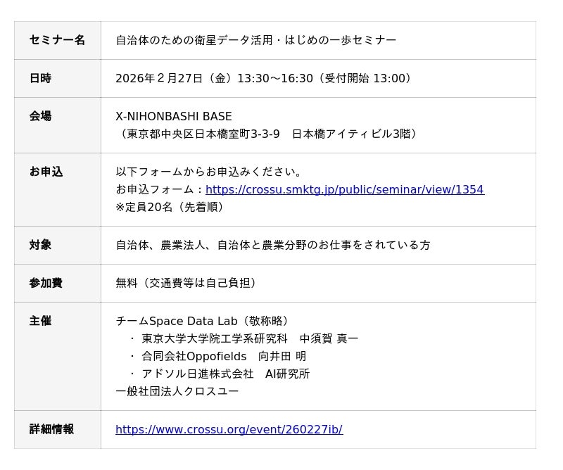 活動の第一弾として、「自治体のための衛星データ活用・はじめの一歩セミナー」を、2026年2月27日に東京・日本橋にて開催いたします。