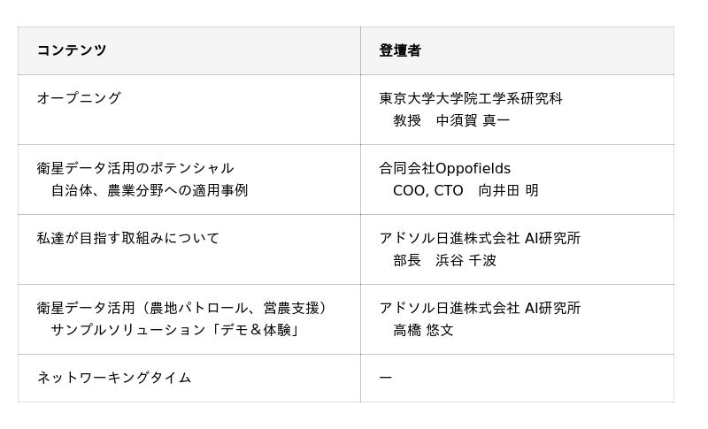 宇宙衛星データは、農業分野をはじめ、地域社会の未来を支える新たなインフラとしての活用が期待されている一方で、実務の現場においては、「専門的で難しそう」「日々の業務とどのように結びつくのか分からない」といった声があがることも少なくありません。こうした課題を踏まえ、「チームSpace Data Lab」は、宇宙衛星データ活用を安心して試せる、中立で開かれた「はじめの一歩」となるきっかけづくりを進めています。特定の製品やサービスの提供・販売を目的とするものではなく、課題や状況に応じた柔軟な試行を重ねながら、それぞれに適した次のステップへとつなげていきます。本セミナーは、その一環として開催するもので、農地監視や営農支援といった持続的な地域社会を支える重要なテーマで、宇宙衛星データ活用について「まずは知る」「試してみる」機会を提供することで、参加者に宇宙衛星データをより身近なものとして捉えていただくとともに、今後の共創や連携に向けた「はじめの一歩」としていただくことを目指します。