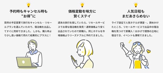 こうした背景を踏まえ、本サービスは、急な事情で予約*を利用できなくなった出品者の心理的負担を軽減し、手間なく次の利用者へ引き継げる仕組みをご提供いたします。また、購入者に対しては、通常は満室で予約が取りづらい日程でも宿泊の機会を確保できるようにし、直前の計画変更にも対応しやすい選択肢をご用意いたします。予約の有効活用を支援することで、出品者・購入者のご利用者皆さまの利便性や満足度の向上につながるよう取り組んでまいります。