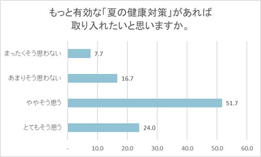 その背景には、気候や生活環境の変化などにより、年間を通じて体調管理への配慮が必要とされる状況が続いていることが挙げられます。なかでも、2025年6月~8月の全国平均気温は、1898年の統計開始以来最高を記録し、例年にない厳しい暑さが続きました。猛暑で知られる埼玉県熊谷市で実施した「猛暑の健康対策に関する調査※3」では、約5割の方が夏場の体調に不安を感じていることに加え、約7割の方が「有効な夏の健康対策を取り入れたい」と考えていることが明らかになっています。