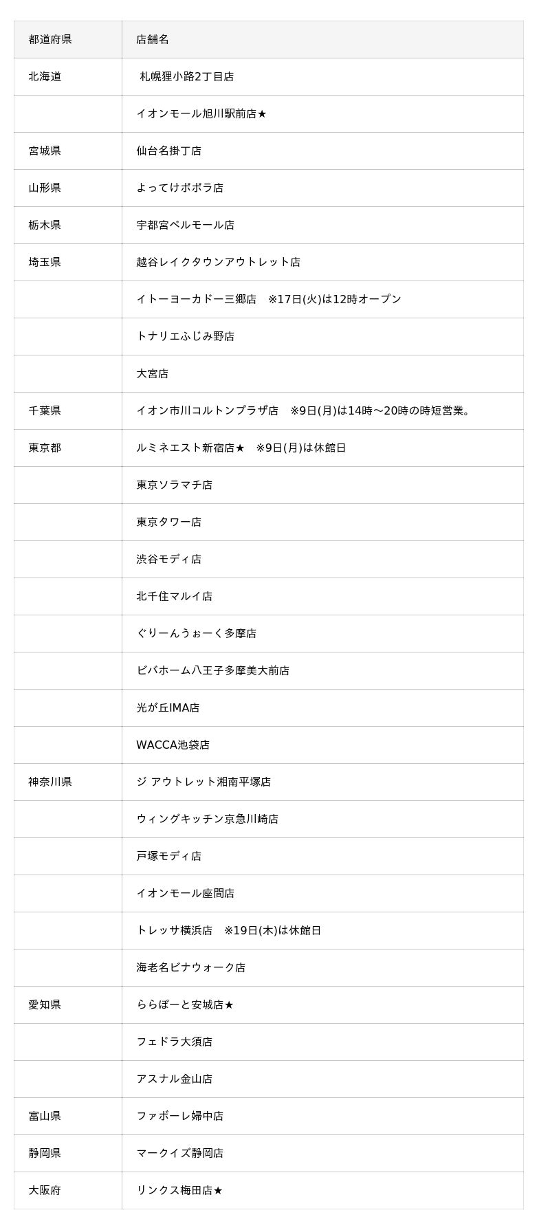 販売店舗: イオンモール旭川駅前店/ルミネエスト新宿店/ららぽーと安城店/リンクス梅田店