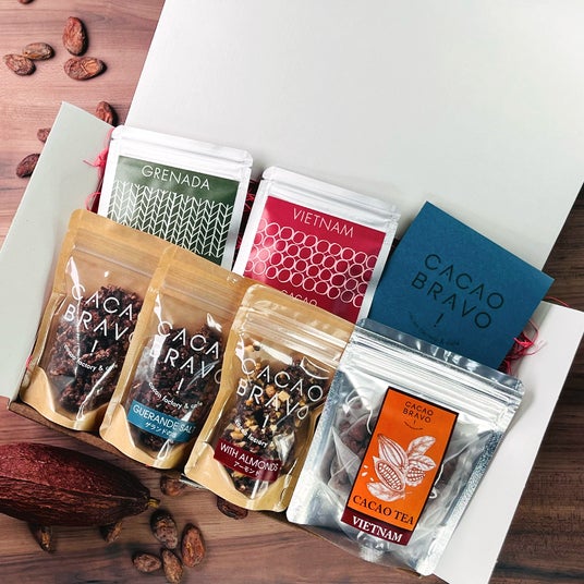 CACAO BRAVO!の自家製チョコレート・人気のニブシュガー・カカオティーをお詰めしたカカオ尽くしのギフトセットです。贈答品としては勿論、元気を出したい時の自分へのご褒美にもぴったりです。