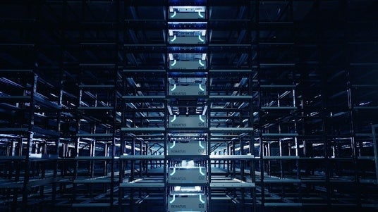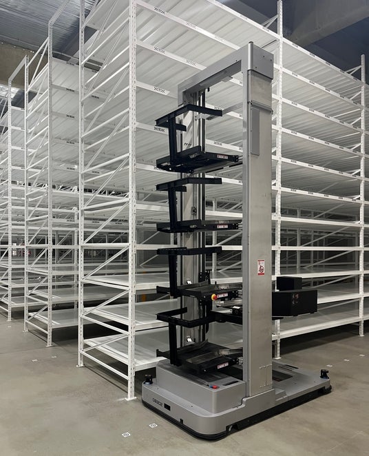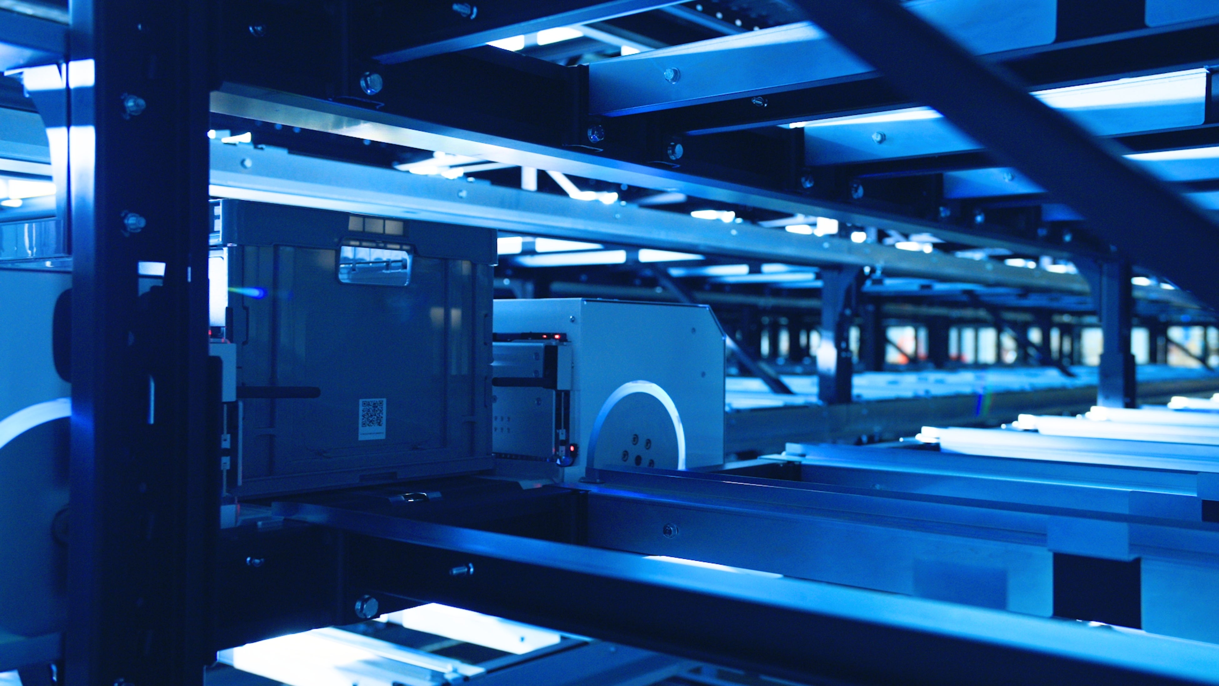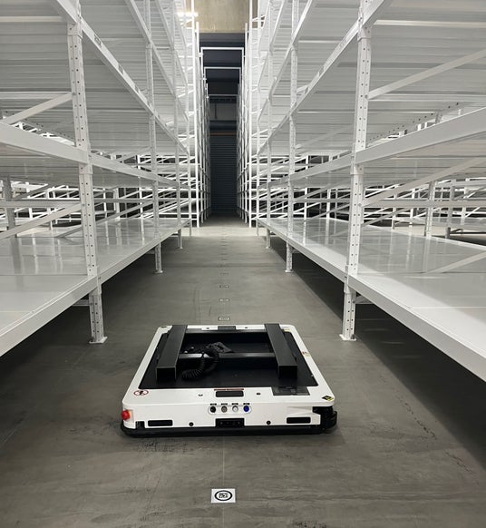 自動入荷検品が完了した商品は、自動搬送システム(AGV等)で自動倉庫または各エリアまで搬送し、在庫管理システムを参照して、庫内の在庫状況に応じて自動出庫されます。