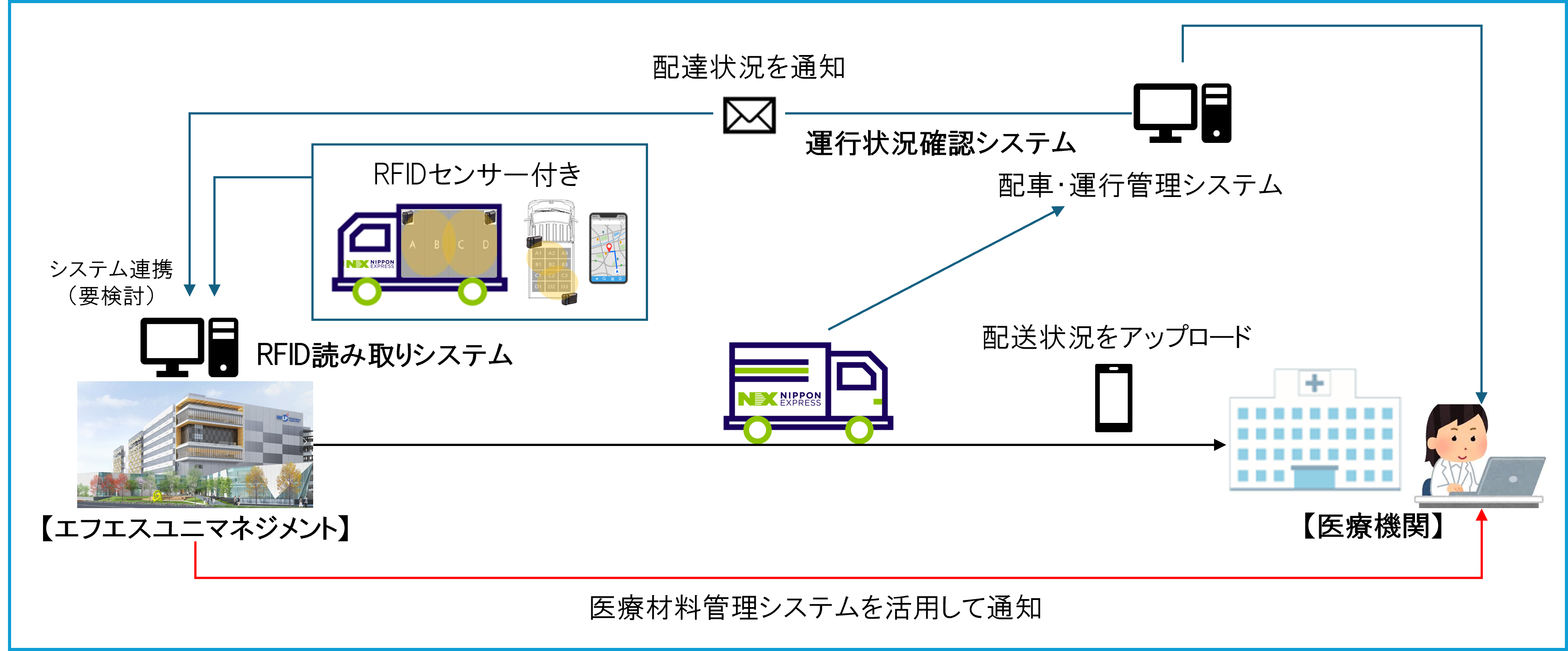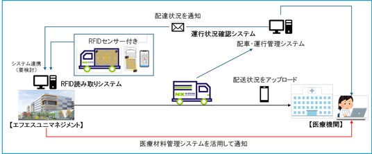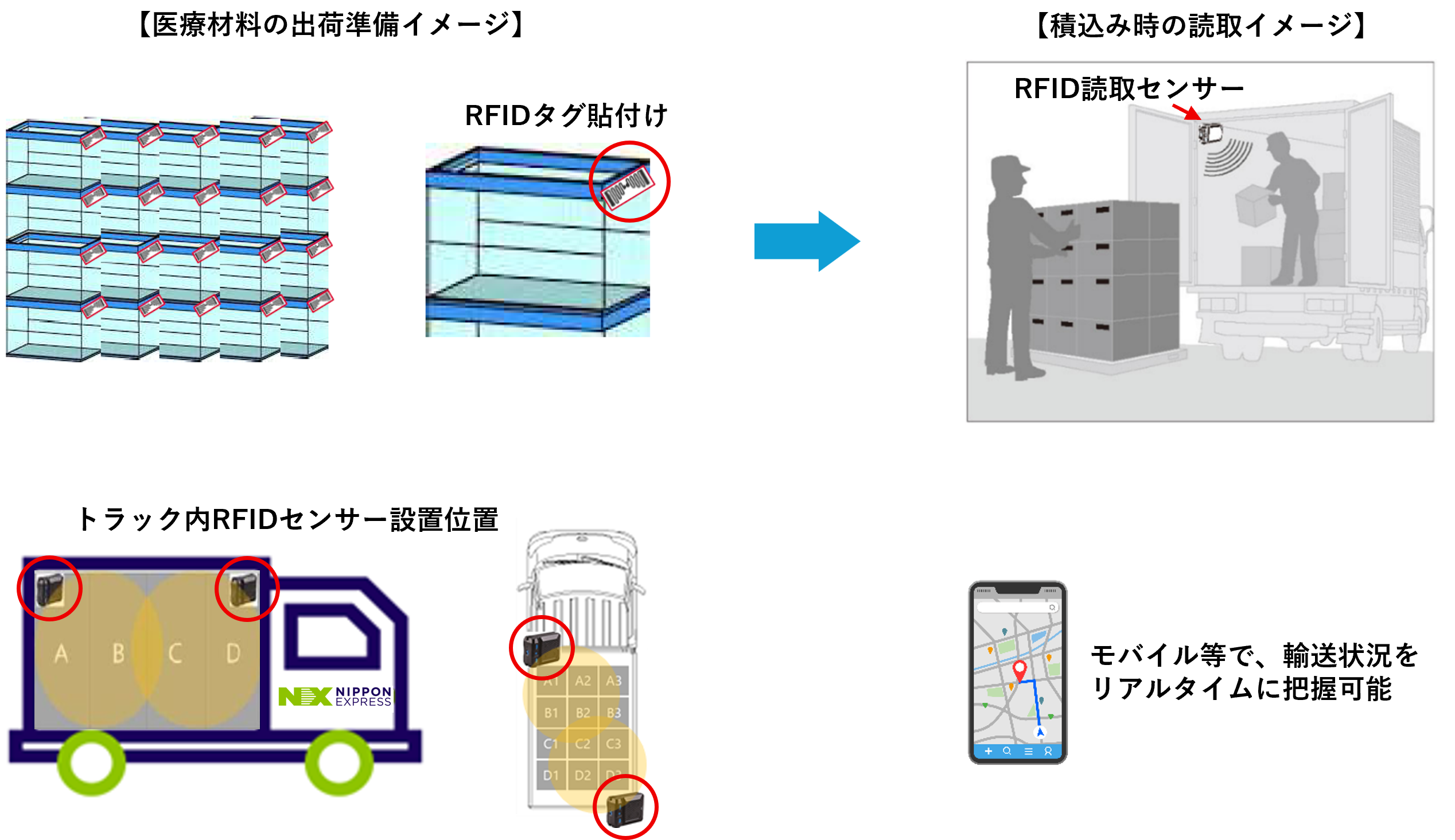 医療材料のトレーサビリティを確立するために、日本通運株式会社(本社:東京都千代田区 代表取締役社長 竹添進二郎 以下 日本通運)との共同スキームで、医療材料に貼り付けたRFIDを活用し、「SHIP グランベース 東京」から各医療機関へ配送されるトラックにもRFIDセンサーを取り付けて、医療材料の出荷から納品までの位置情報をリアルタイムで追跡・管理するトラッキングシステムを開発します。