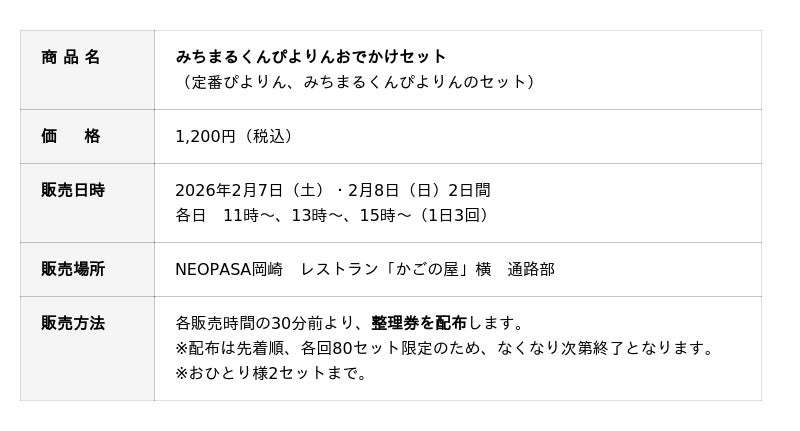 E1A 新東名高速道路 NEOPASA岡崎(集約)にて、2026年2月7日(土)・2月8日(日)の2日間、数量限定で「みちまるくんぴよりんおでかけセット」が販売されます。