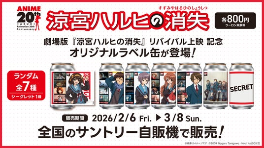 エンターテインメント商品・サービスの企画・開発を行う株式会社スペースファクトリー(本社:東京都千代田区)は2026年2月6日(金)よりリバイバル上映を開始する劇場版『涼宮ハルヒの消失』のTAG LIVE LABEL(オリジナルラベル缶)を、全国のサントリー自販機で2月6日(金)より順次販売開始いたします。