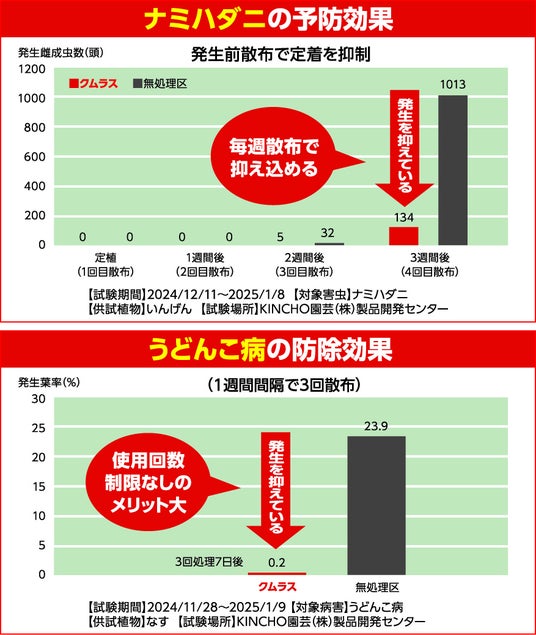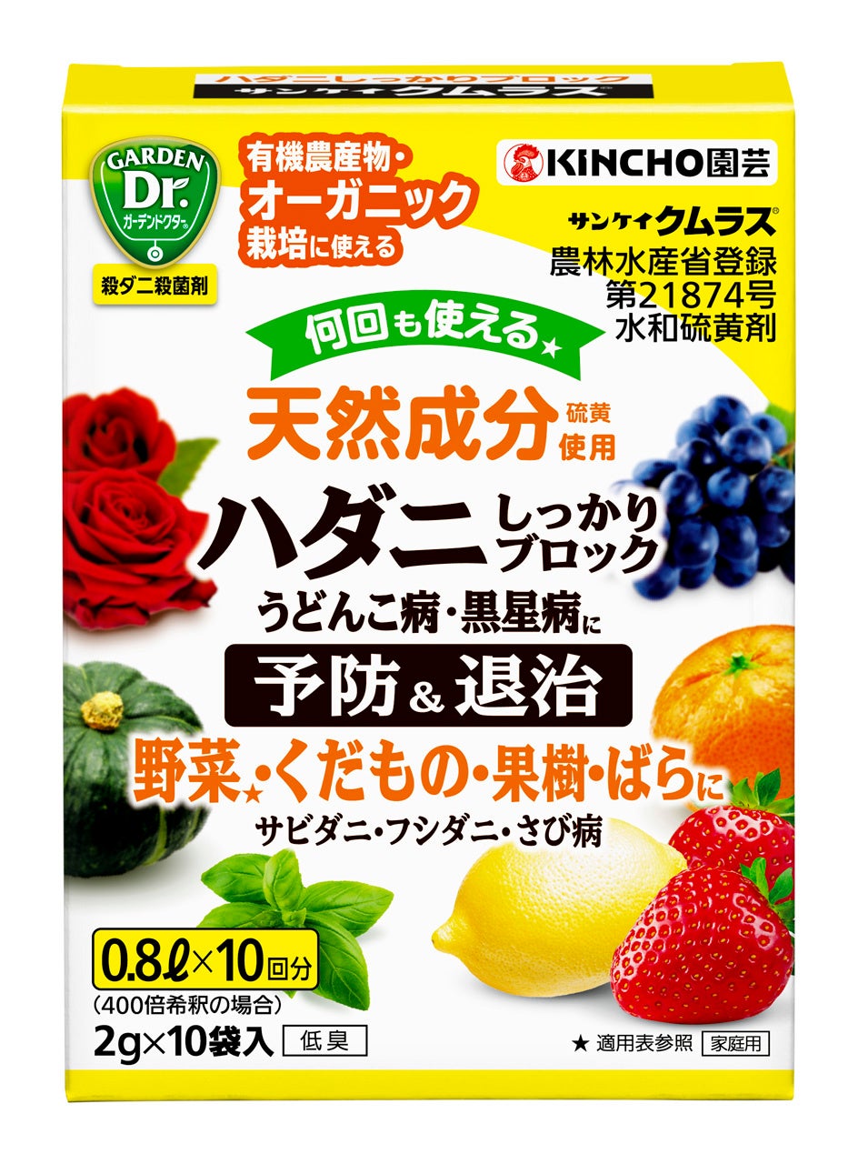 家庭園芸用薬品・肥料等を製造販売するKINCHO園芸株式会社(本社:東京都中央区/代表取締役社長:森本 義之)は、ハダニの防除に優れた効果を発揮し、さらにうどんこ病や黒星病など、主要病害にも幅広く対応できる殺ダニ殺菌剤「サンケイ クムラス」を2026年1月に新発売いたしました。