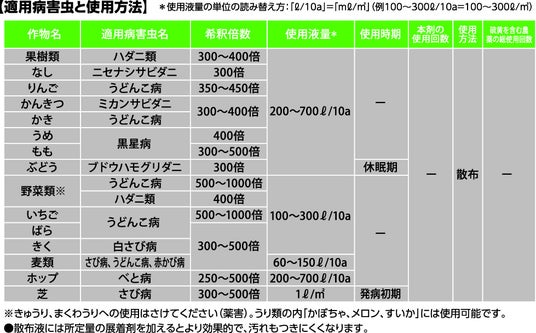 本剤は野菜類・果樹類・ばらなど幅広く使えるほか、年間の使用回数制限がないため、必要な時に継続して散布できる点も大きな特長です。また、有機JAS規格を取得した天然成分で、オーガニック栽培ユーザーにも手軽にお使いいただけます。