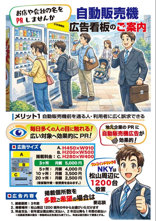 愛媛県松山市に本社を置く三福グループの株式会社エヌケイワイは、松山周辺に設置している約1,200台の自動販売機を活用した「自動販売機広告看板サービス」を本格的に展開いたします。