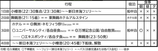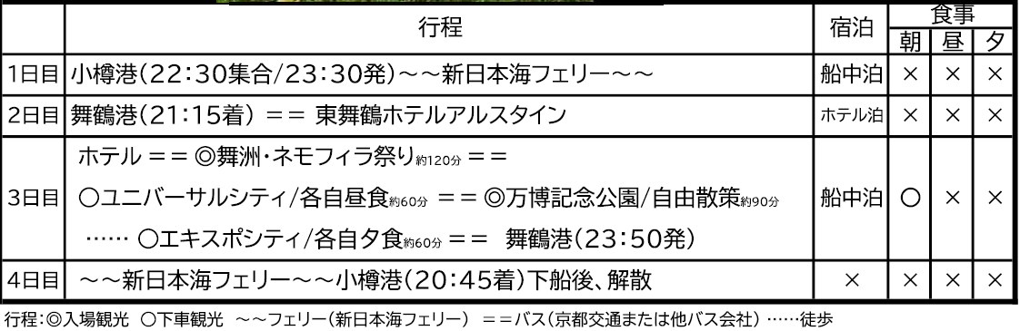 新日本海フェリー往復乗船代・ホテル宿泊代(1泊)・食事代(朝1回)・バス代(3日目)・入場料(舞洲ネモフィラ祭り・万博記念公園)・消費税等諸税
