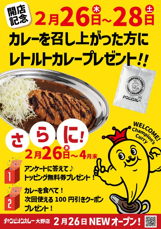 株式会社チャンピオンカレー(本社:石川県野々市市、代表取締役:南 恵太)は、2026年2月26日(木)、福井県大野市に『チャンピオンカレー大野店』をグランドオープンいたします。