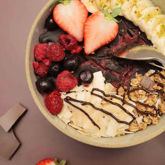 チョコレートを“割って”食べる、新感覚のアサイーボウル。もったりしたアサイーベースの上に、チョコレートをコーティング。スプーンで軽く叩いて割り、食べるとパリパリと心地よい音と食感が楽しめるのがオススメポイントです。THE_B自家製のチョコレートはココナッツオイルベースでシンプルな材料のみを使用した乳製品不使用のプラントベース仕様。また、ブルーベリーやラズベリー、バナナなどのフルーツをふんだんに使用し、美味しさだけでなく、むくみやくすみ対策など美容面も意識した一杯です。