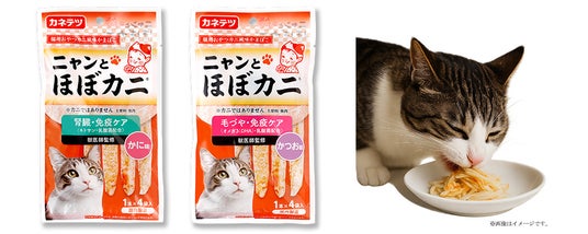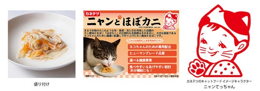 「人も猫ちゃんも同じ食卓で笑顔に」をテーマに、2014年の発売以来累計販売数量8,000万パックを突破した話題のカニ風味かまぼこ「ほぼカニ(R)」から、ニャンと!猫ちゃんのための“ほぼカニ(R)”が誕生。さらに、カネテツのキャットフードのイメージキャラクターとして「ニャンてっちゃん」が登場します。