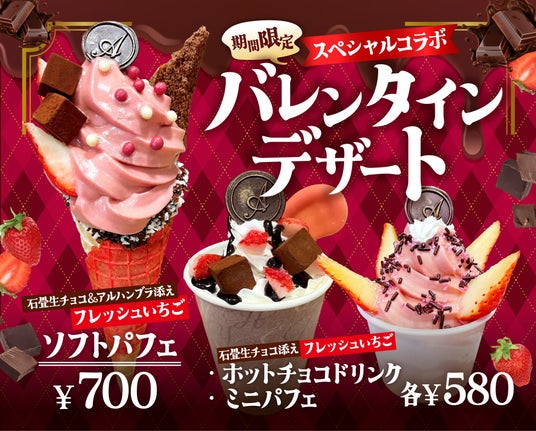 ・ ソフトパフェ(700円) ベルギー産のクーベルチュールと厳選生クリームで作られたアルムの「石畳生チョコ」、そしてガナッシュクリームたっぷりの職人手作りケーキ「アルハンブラ」を添えた至高の一品です。甘酸っぱい苺とのハーモニーをお楽しみいただけます。※しまなみ温泉喜助の湯限定