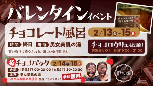 1. 全身で甘い香りに包まれる「チョコレート風呂」&「苺チョコパック」今回のイベントの目玉は、五感でバレンタインを楽しむ体験型コンテンツです。