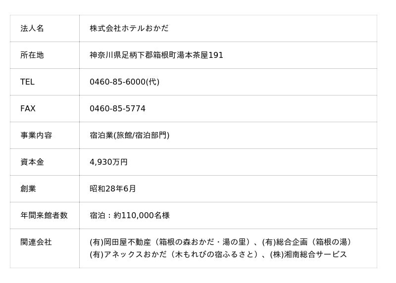 「ホテルおかだ」は、温泉旅館としての伝統と現代的な快適さを融合させた宿泊施設です。豊かな自然に囲まれた箱根湯本に位置し、多彩な温泉と上質なサービスでお客様をお迎えいたします。
