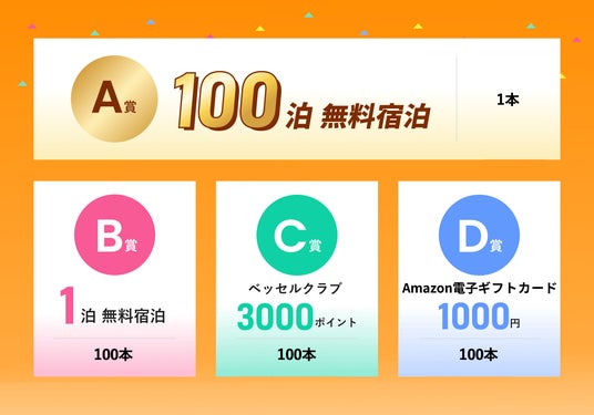 「ベッセルクラブ」の会員数が100万人を突破したことを記念し、日頃のご愛顧に感謝の気持ちを込めて、「ベッセルクラブ100万人達成キャンペーン ついに突破!ありがとう大感謝祭!」を2026年2月2日(月)から実施します。ベッセルホテルズ全ホテルで使える「年間で最大100泊まで無料宿泊」が1名様に当たるほか、「1泊無料宿泊」、「ベッセルクラブ3,000ポイント」、「Amazon電子ギフトカード1,000円分」など、抽選で総計301名様にプレゼントいたします。