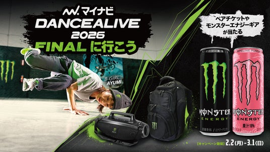 国内No.1エナジードリンク(※)のモンスターエナジーは、2026年2月2日(月)~3月1日(日)の期間、日本発の1on1形式の世界最大規模のストリートダンスバトル「マイナビDANCEALIVE 2026 FINAL」のペアチケットなどが当たるキャンペーン「マイナビDANCEALIVE 2026 FINALに行こう」を開催いたします。