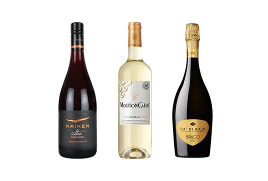 〔ワイン3本:カ・ディ・ライオ スプマンテ・ブリュット、カイケン・ウルトラ・ピノ・ノワール、ムートン・カデ・ブラン、デジタルKFCカード(500円分)〕