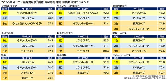 『食材宅配 東海』評価項目別ランキング(2026年 オリコン顧客満足度(R)調査)