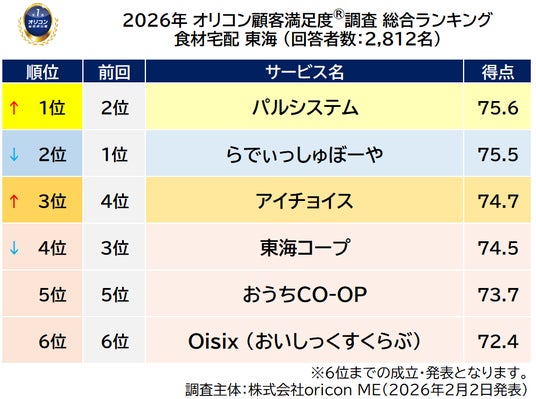 『食材宅配 東海』総合ランキング(2026年 オリコン顧客満足度(R)調査)