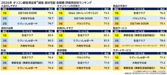 『食材宅配 首都圏』評価項目別ランキング(2026年 オリコン顧客満足度(R)調査)