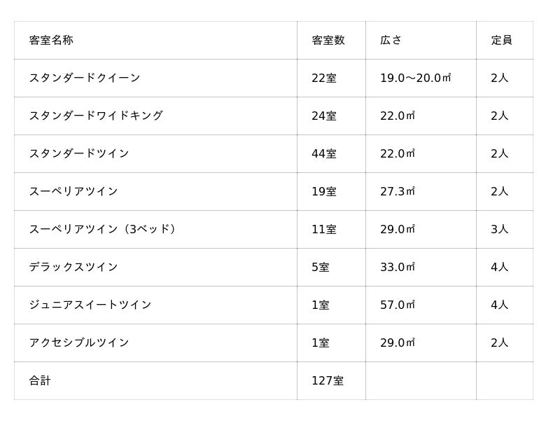 3.ファミリーやグループでの多様な利用ニーズに対応するため、ジュニアスイートツイン1室・デラックスツイン5室をリニューアル。内装・家具・備品を一新し、最大4名まで宿泊可能な客室として改修。