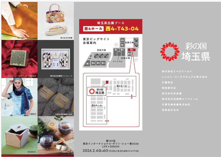 埼玉県ブースは西展示棟 西4ホール(4階)、産地ならではの職人の技や伝統技術をモダンにアレンジした逸品が集結する「伝統とModernの日本ブランドフェア」エリアに出展します。