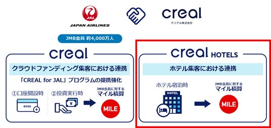 配当先の1社である日本航空株式会社(本社:東京都品川区、代表取締役社長:鳥取 三津子、以下「日本航空」)とは、当社が運営する不動産クラウドファンディングサービス「CREAL(クリアル)」の提携サービスとして、約4,000万人のJALマイレージバンク(JMB)会員の方対象に、投資金額に応じてマイルがたまる「CREAL for JAL」を2020年より展開しておりますが、今回のクリアルホテルズのプログラムは業務提携後の新たな取り組みとなります。