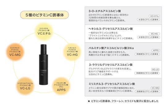 5種類のビタミンC誘導体を独自のバランスで配合し、即効性と持続性、機能性を兼ね備えた「次世代のビタミンCケア」