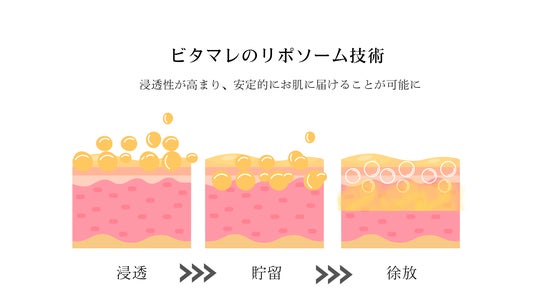 5種のビタミンC誘導体をはじめとする厳選した美容成分を肌で弾かれずに確実に届けられるように、肌のバリア機能を担う皮脂膜やセラミドと同様の構造を持つ「脂質2分子膜(リポソーム構造)」を採用しました。浸透の常識を変える3つの革新
