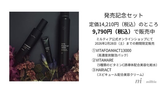 ミルティア株式会社は、新製品「VITAMARE」の発売を記念し、「高濃度炭酸泡パック・5種のビタミンC誘導体配合美容化粧水・スピキュール配合美容クリーム」のセットを期間限定で発売いたします。(2026年2月28日まで)