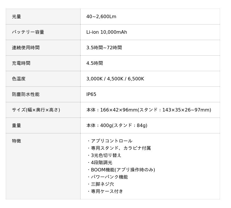 最大2,600ルーメンの圧倒的な光量と10,000mAhの大容量バッテリーを搭載し、広範囲を照らす次世代のエリアライトです。