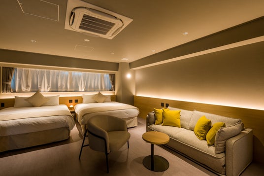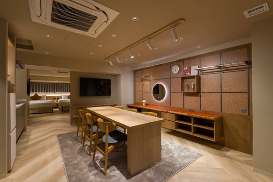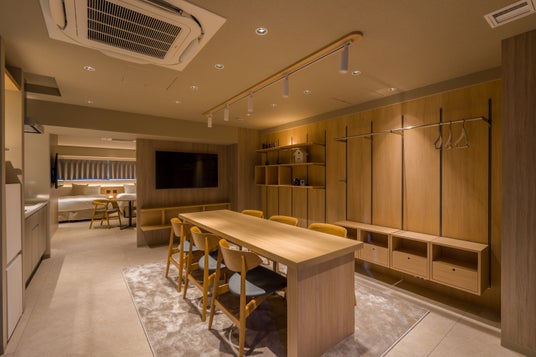 全9室の客室はいずれも75平方メートル と広々としており、1室あたり最大6名様のご宿泊が可能です。また、中長期滞在のニーズに応え、全室にIHキッチン、オーブンレンジ、コーヒーマシン、調理器具、乾燥機付き洗濯機、Dyson ドライヤー、BALMUDA空気清浄機、55インチネットTV、Wi-Fiを備えています。ベッドは180cm幅のクイーンサイズ(シングルベッド×2台分)×2セットを配置。 (5名以上のご利用の場合はソファベッドのご用意となります。)リビングに設置された可変式の壁面収納家具「Sumu Wall」は、自分の旅のスタイルに合わせてカスタマイズができ、洋服や仕事道具を整理したり、旅の記念品を飾るなど、インスピレーションを求める中長期滞在にも最適な設計となっています。