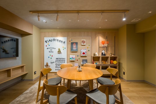 [Sumu Playground](1室)子どもたちが遊びを通じて日本文化や上野の魅力に触れられるお部屋。リビングのSumu Wallには子どもたちの好奇心を刺激する、おもちゃや絵本、ぬいぐるみなどが満載で、長い滞在中も飽きさせません。大人も一緒に楽しめる仕掛けで、家族の滞在がもっと豊かになります。