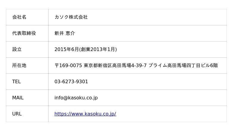 カソク株式会社は、創業2013年(設立2015年)の東京都新宿区に本社を置くホテルの開発・運営コンサルティング会社です。企画・設計から開発、販売、運営までを一気通貫で支援し、アパートメントホテル、ビジネスホテル、戸建てホテルなど、東京・大阪を中心に全国で50棟超の宿泊施設を展開しています。