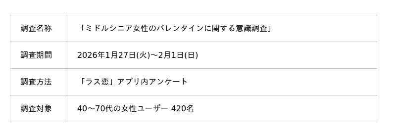 株式会社ラス恋(アイザックグループ/本社:東京都渋谷区/代表取締役CEO : 山口 昂星)が運営する、人生経験でつながるマッチングアプリ「ラス恋」は、40~70代の女性420名を対象に「バレンタインに関する意識調査」を実施。チョコレートの消費者物価指数が1年で35.7%上昇(※1)する中、「ラス恋」女性ユーザーの83.3%が「何らかの形でバレンタインに参加したい」と回答。特に78.1%は誰かに「チョコレートを渡したい」と考えていることが分かりました。