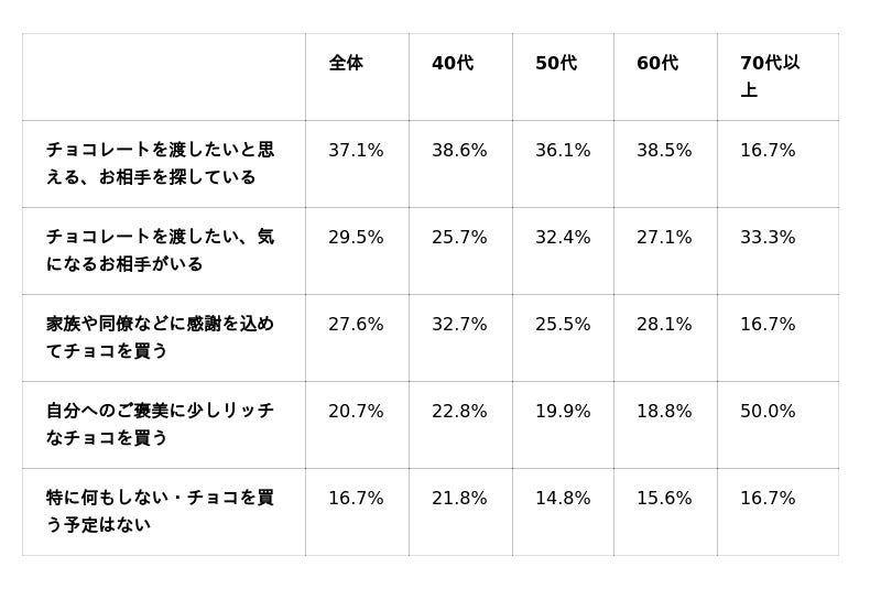 - 40代:「お相手を探している」38.6%だが、「家族・同僚に感謝チョコ」も32.7%で義理チョコ文化が根強い