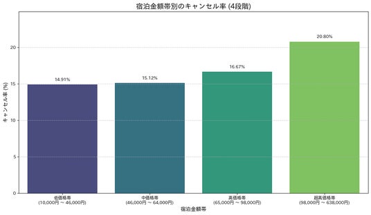 宿泊合計金額を4つの価格帯(四分位数)に分けて分析した結果、金額が高いほどキャンセル率が高いことが判明しました。- 低価格帯(~約4.6万円): キャンセル率 14.91%