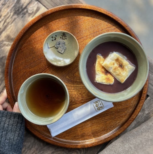 ぜんざいには、粒を残して炊き上げた大粒の大納言小豆も入っており、小豆の食感と風味を損なわないように丁寧に炊き上げています。ほどよい甘さと小豆の風味、そして注文を受けてからお焼きするお餅の香ばしさをお楽しみいただけます。
