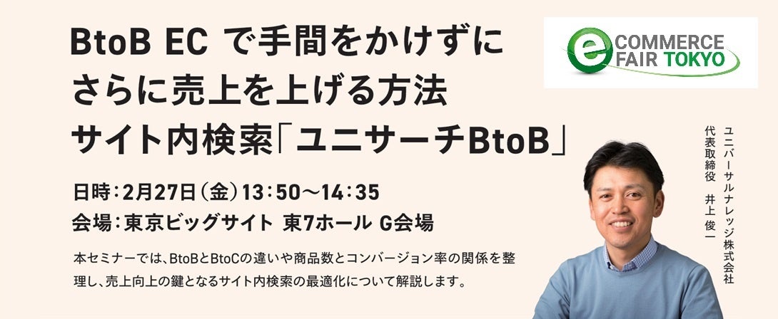 ユニバーサルナレッジ株式会社(東京都渋谷区:代表取締役 井上俊一)は、2026年2月26日(木)・27日(金)に東京ビッグサイトで開催されるイーコマースフェア 東京 2026に、AIサイト内検索「ユニサーチBtoB」を出展、2日目には代表井上が『BtoB EC で手間をかけずにさらに売上を上げる方法 サイト内検索「ユニサーチBtoB」』と題したセミナーに登壇いたします。