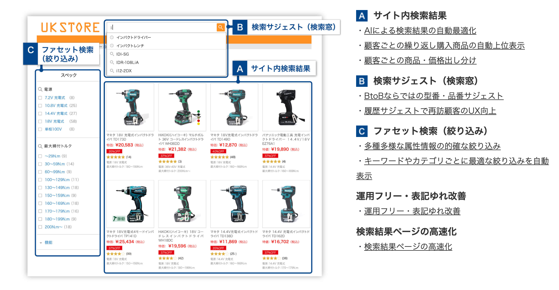 「ユニサーチBtoB」は、AIによる検索結果の自動最適化や顧客別のパーソナライズ表示機能も搭載したサイト内検索ツールです。規格・属性条件検索や型番サジェスト、顧客・会員種別に応じた商品・価格の表示制御機能など、BtoB ECサイトに必要な機能を提供しています。