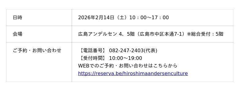株式会社アンデルセン(本社:広島県広島市中区、代表取締役 社長執行役員 松本 真一)は、2026年2月14日(土)、広島アンデルセン(所在地:広島県広島市中区)にてウエディングフェアを開催します。