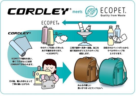 環境に優しい素材(タフガード(R)ライト)。人工皮革のベースとなる不織布に再生ペットボトルを使用したランドセルです。