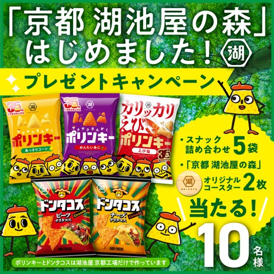 「京都 湖池屋の森」の始動を記念し、間除伐材で製作した「オリジナルコースター」と、現在「湖池屋 京都工場」だけで製造されている「ドンタコス」「ポリンキー」を詰め合わせにした特別なセットが10名様に当たるキャンペーンを実施します。この機会にぜひご応募ください!