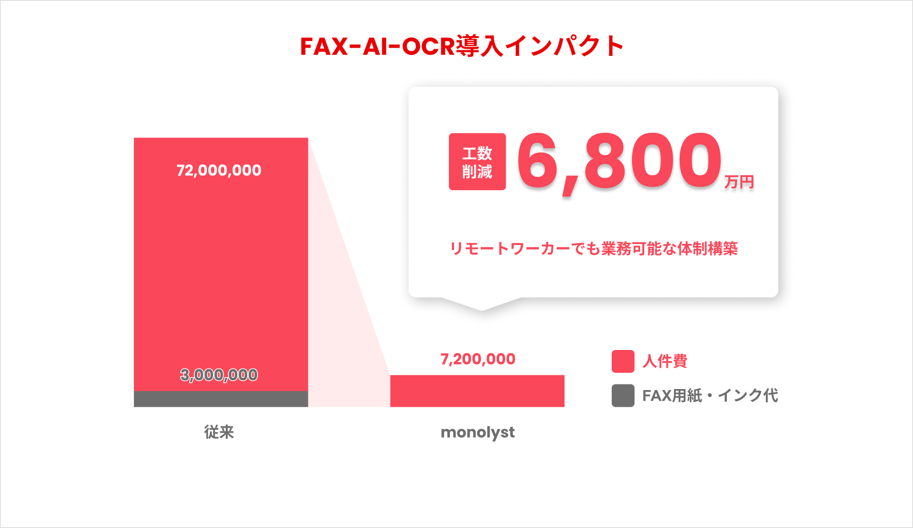 1日FAX1000枚、年間24万枚の会社様で工数・コストを試算すると、年7,500万円に上りますが、monolystを導入するとFAX用紙・インク代を含め90%のムダな業務・コストの削減を期待できます。