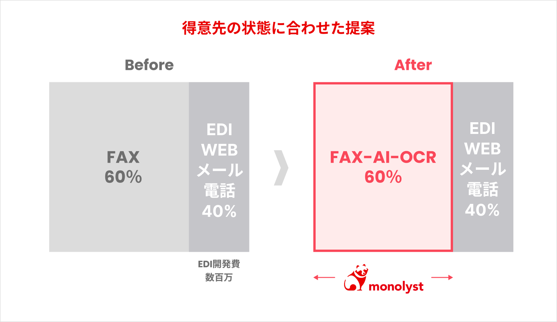 また、取引金額が大きい得意先についてはEDI連携が進んでいる一方、EDIの開発金額が数百万円にのぼることがあり、全ての得意先でEDI連携しているわけではありません。60%以上の得意先とのやり取りでは以前としてFAXが残っています。