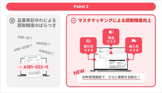 - AI-OCRによる解析結果に対し、商品・取引先・納入先のマスタとマッチングし、読取精度をさらに向上します。