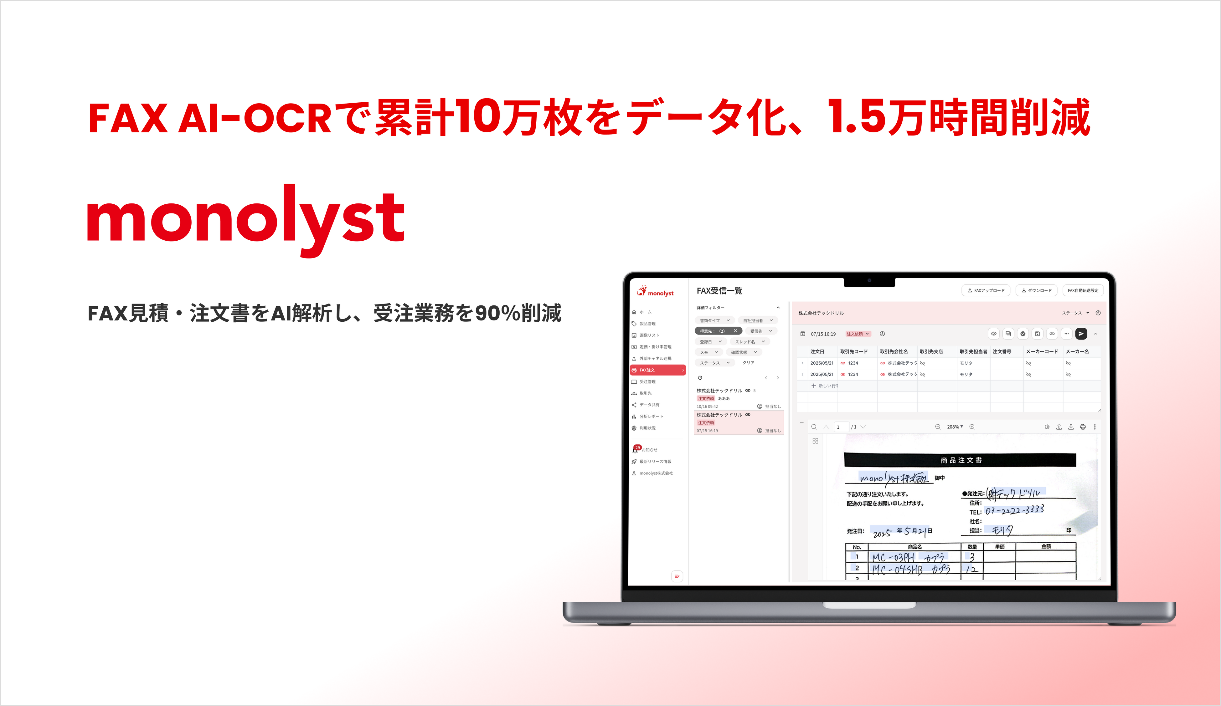 monolyst「FAX AI-OCR」は機械工具・自動車部品・建材 業界に特化したFAX解析のサービスです。